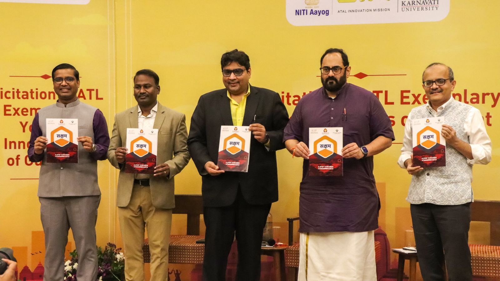 𝗦𝗵𝗿𝗶 𝗥𝗮𝗷𝗲𝗲𝘃 𝗖𝗵𝗮𝗻𝗱𝗿𝗮𝘀𝗲𝗸𝗵𝗮𝗿, Hon'ble Minister of State for Skill Development and Entrepreneurship & Electronics and Information Technology, Government of India Felicitated ATL Exemplary Young Innovators of Gujarat on 18 October 2022, at Karnavati University, Gandhinagar.